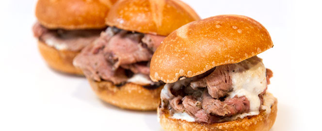 Prime rib topped with Provolone cheese on a pretzel bun, served with au jus [[&}] horseradish sauce