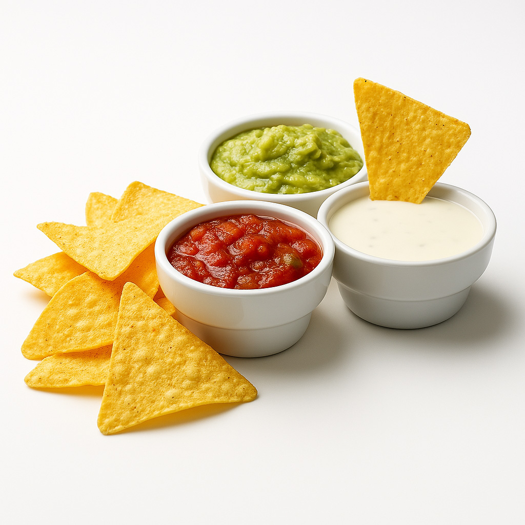 Corn tostada chips served with salsa, guacamole [[&}] melted queso blanco