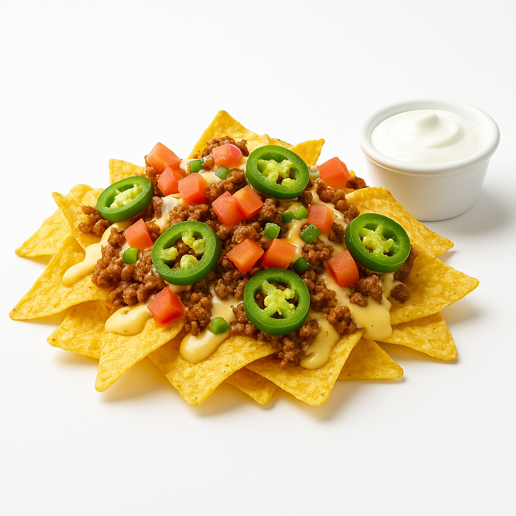 Corn tostada chips with beans [[&}] mixed cheese, lettuce, pico, jalapeños, sour cream. Chicken, Steak or Combo