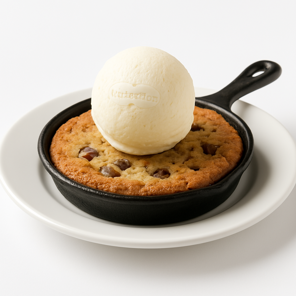 Chocolate chip cookie in a warm skillet topped with Häagen-Dazs vanilla ice cream